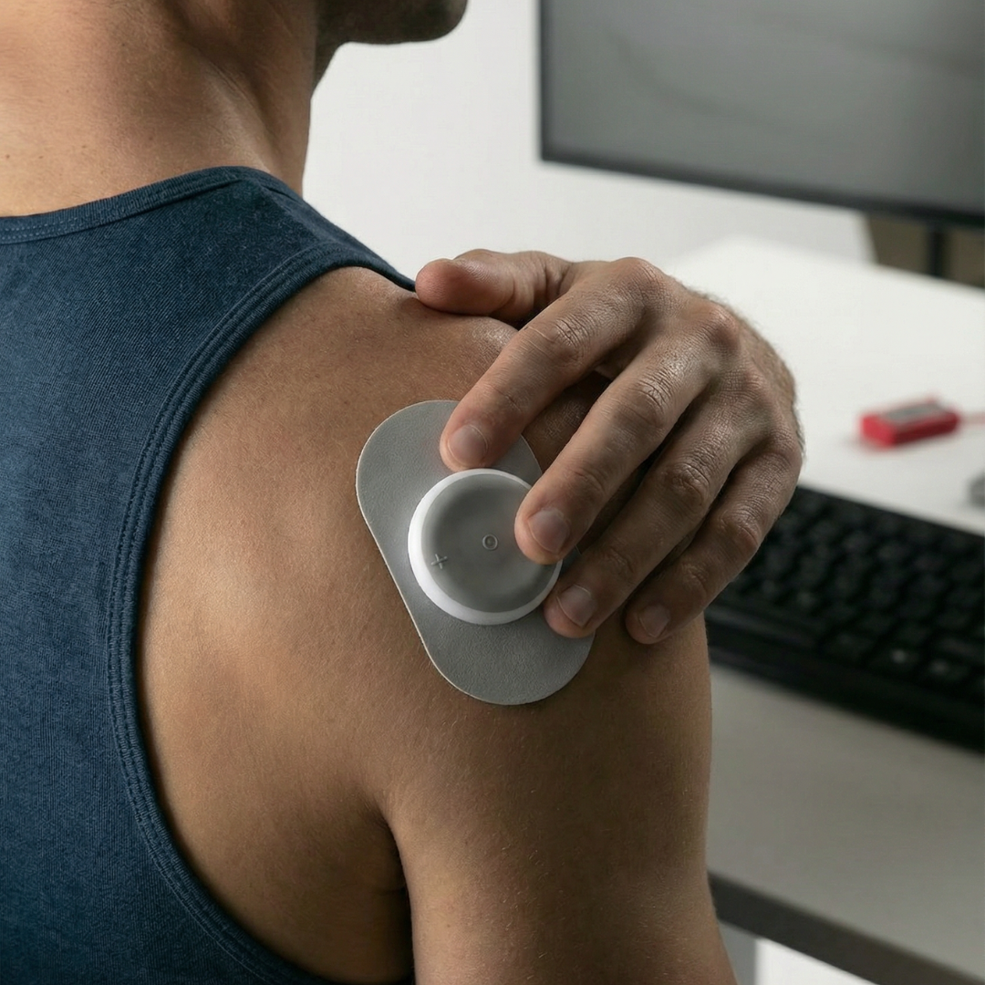 Trådlös nerv- och muskelstimuleringsenhet för stillasittande arbete.